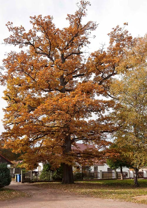 Das Bild zeigt einen hohen Baum mit Herbstlaub vor einem Einfamilienhaus.