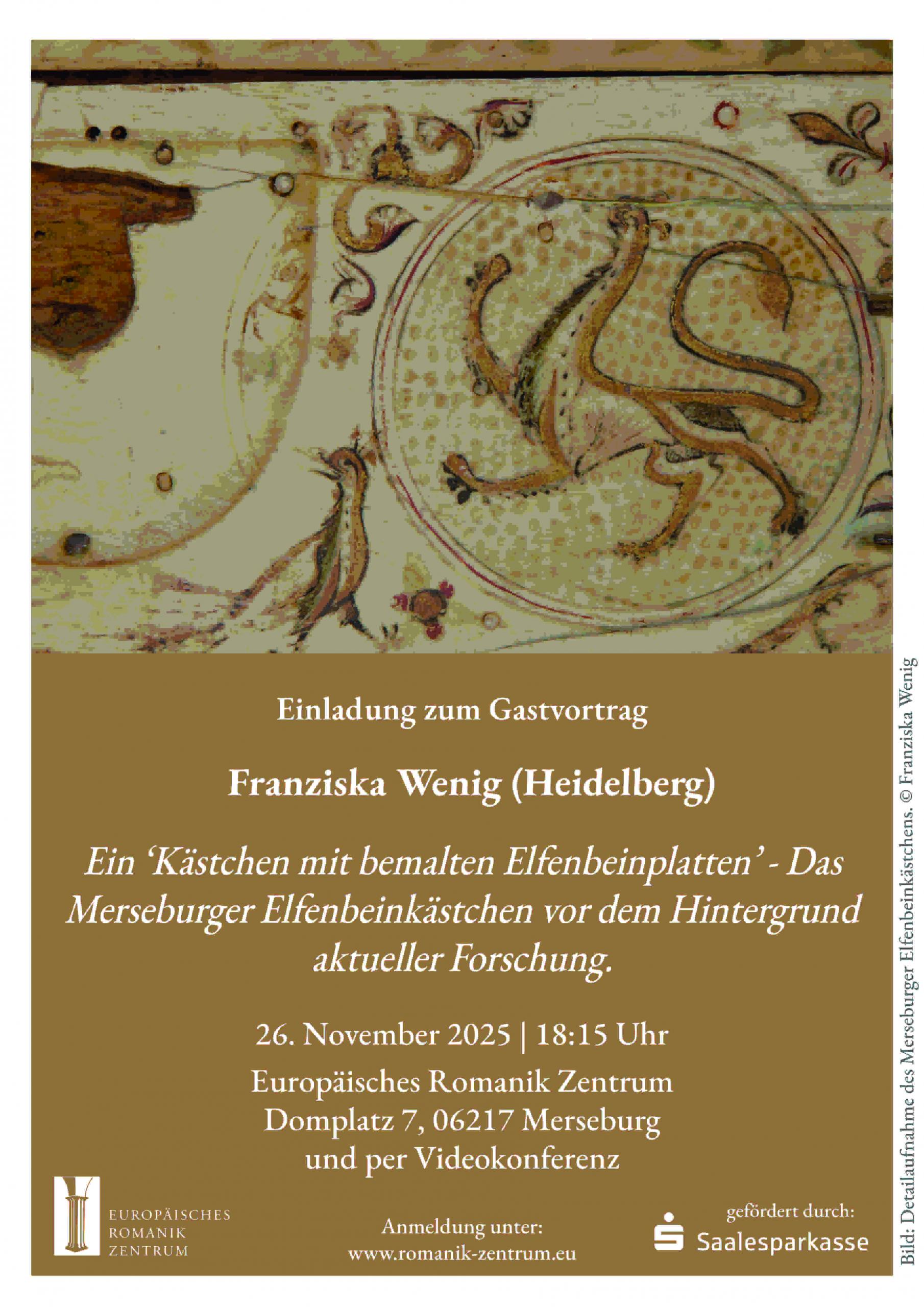 Hiermit lädt das Europäische Romanik Zentrum Sie herzlich ein zum Gastvortrag von Frau Franziska Wenig (Heidelberg). Sie wird über das Thema „Ein ‘Kästchen mit bemalten Elfenbeinplatten’ - Das Merseburger Elfenbeinkästchen vor dem Hintergrund aktueller Forschung.“ sprechen.