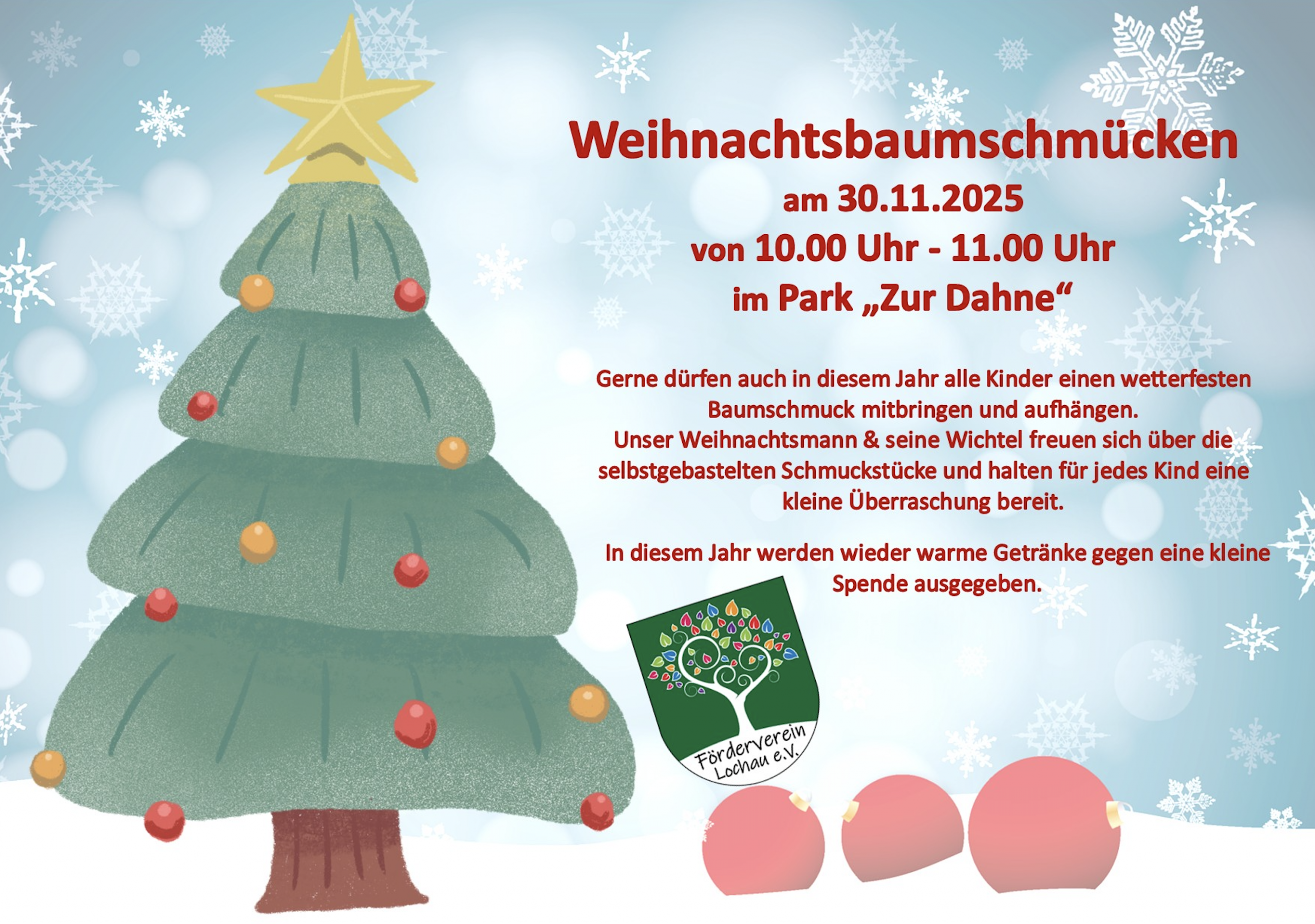 In Lochau wird wieder der Weihnachtsbaum im Park zur Dahne geschmückt. Unser Weihnachtsmann verteilt kleine schokoladige Präsente an alle Kinder, die etwas selbst gebasteltes für unseren schönen Baum mitbringen.